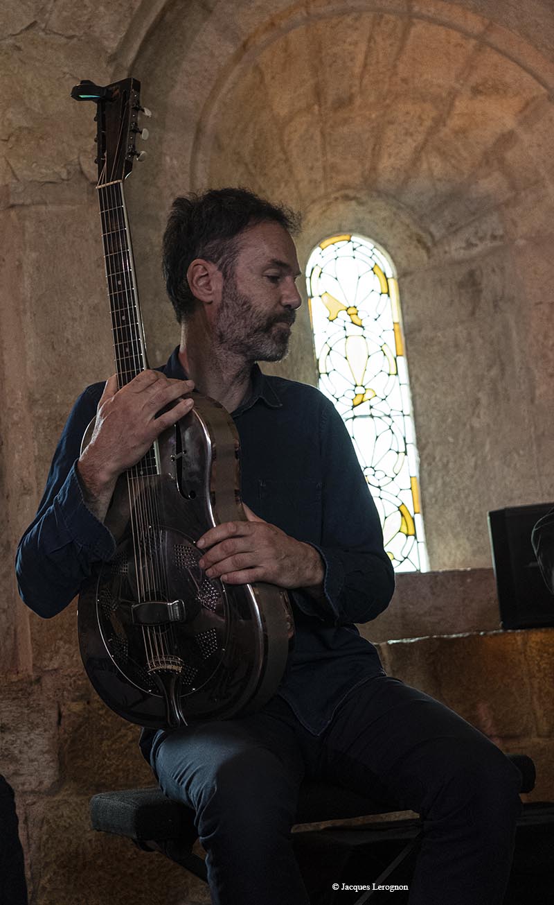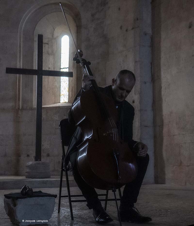 18h30, lumière naturelle- il fait sombre en cet après-midi orageux- pour accueillir Vincent Segal et son violoncelle. Le musicien semble entamer une conversation avec les lieux, utilisant toutes les possibilités – on peut penser qu’il en essaye de nouvelles – de son instrument, l’archet qui virevolte et qui semble démultiplié comme ses doigts qui pizzicatent avec bonheur. Les pierres vibrent. Le public aussi. Du fond de la salle, sourd la trompette d’Erik Truffaz qui entame non pas un dialogue mais une trinité entre son instrument, les vieilles pierres et son ami Vincent Segal. Avec eux, les spectateurs voyageront dans l’espace et dans le temps. Ils voleront haut jusqu’à la voûte de l’abbatiale, et plus loin encore. Le violoncelle se rappelle sous les doigts du musicien des processions des moines, de l’aube froide et des crépuscules soyeux, la lumière qui transperce les oculi, les gémissements des miséricordes. Lui répond le souffle du trompettiste, qui joue, s’empare d’un bout de thème, et l’emmène ailleurs. Improvisation totale, pendant plus d’une heure, époustouflante de virtuosité. Pour autant, la technique parfaite ne voile pas l’émotion à fleur de notes et de sons. Vincent Segal et Erik Truffaz jouent, s’amusent et enchantent le public. Un moment d’exception salué par une standing ovation longue et appuyée.