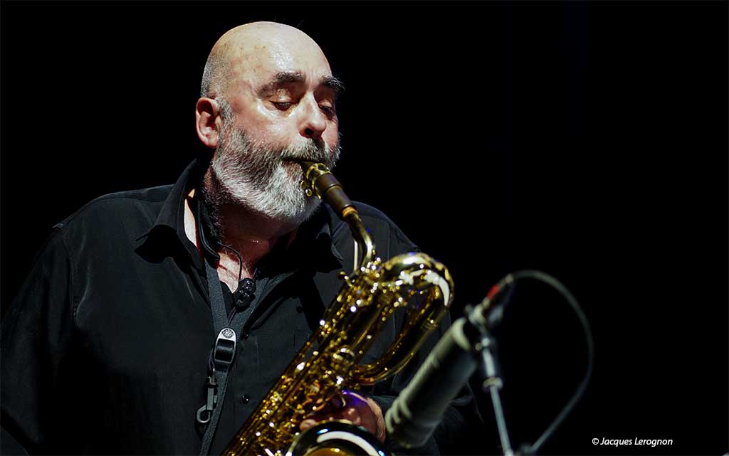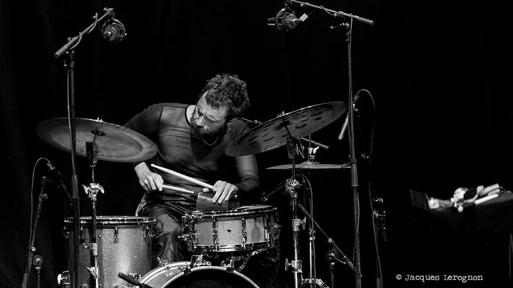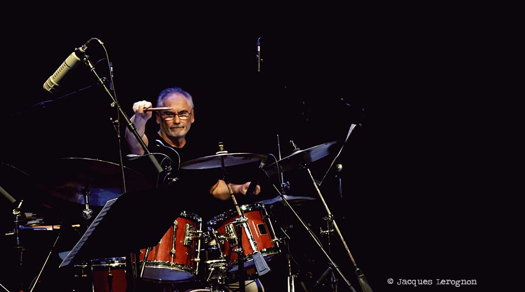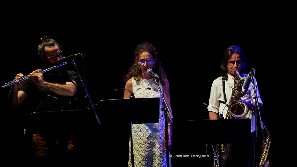 en dialogue avec le saxophone ou la contrebasse d’Éric Chalan. La forte présence de la batterie de Jean-Pierre Julian