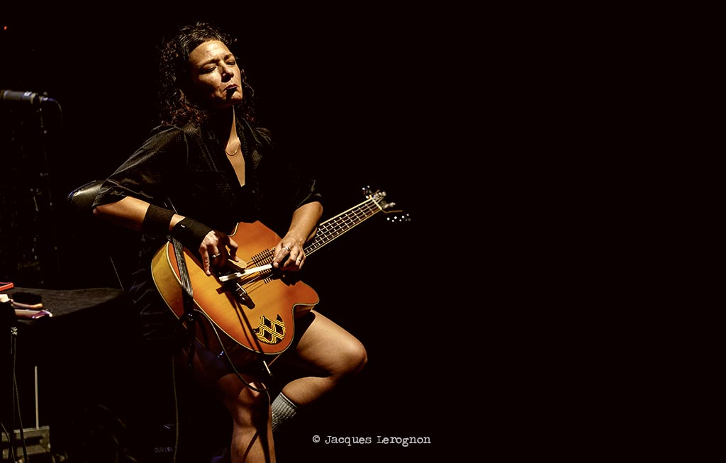 Haleïs est un mot de vieux français signifiant « cri retentissant » nous explique la chanteuse et compositrice avant de laisser Fanny Lasfargues introduire le concert avec sa basse électro-acoustique pourvue d’un copieux set de pédales. Elle anime les cordes une étrange boule de métal, gardant son médiator entre les lèvres.