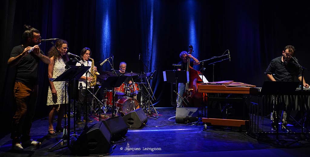 Le régisseur et son équipe ont bien bossé pendant la pause. L’espace sur la scène est bien occupé par un marimba et un vibraphone, une batterie, une contrebasse et trois pupitres pour le sextet de Jean-Pierre Julian.