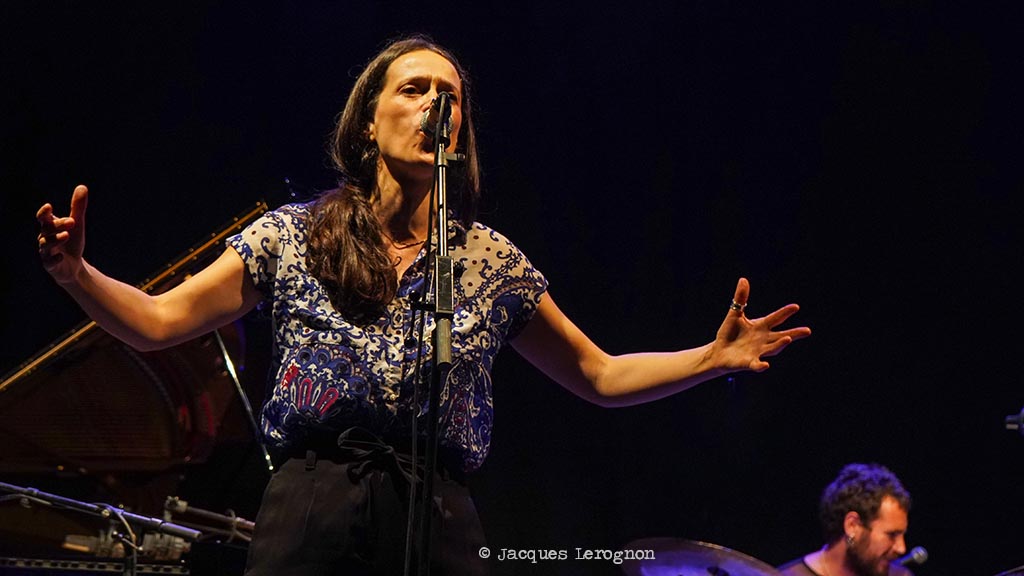 se joignent aux deux jeunes femmes. Inspirés de textes médiévaux, les chansons qui se succèdent sont comme de longues plaintes où la voix de Juliette Meyer est propulsée par ses trois acolytes et leur instrument. La musique va du médiéval au contemporain, piano préparé, batterie accessoirisée, basse insolite voire baroque. La tonalité n’est pas joyeuse mais on rentre vite dans une espèce d’enchantement accentué par la gestuelle des musiciens. Les bras en croix ou les mains serrées autour du micro de la chanteuse, la concentration du batteur, les yeux clos qui se couche sur ses toms comme le faisait, en son temps, Bill Evans sur son clavier.