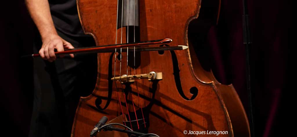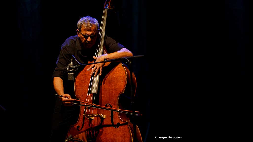 19h, on passe aux choses sérieuses avec In Spirit, le concert en solo de Claude Tchamitchian. Il nous présente en quelques mots son projet et la magnifique contrebasse sur laquelle il va jouer. Celle de Jean-François Jenny-Clark accordée pour l’occasion en Mib-La-Mib-La. Trois suites, la première en quatre parties permet à Claude Tchamitchian de développer ses idées rythmiques, son jeu à l’archet ou en « pizz » et ses improvisations.