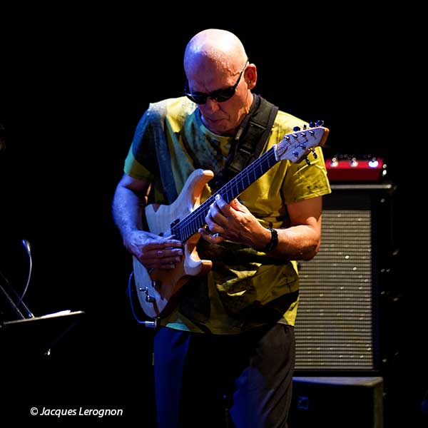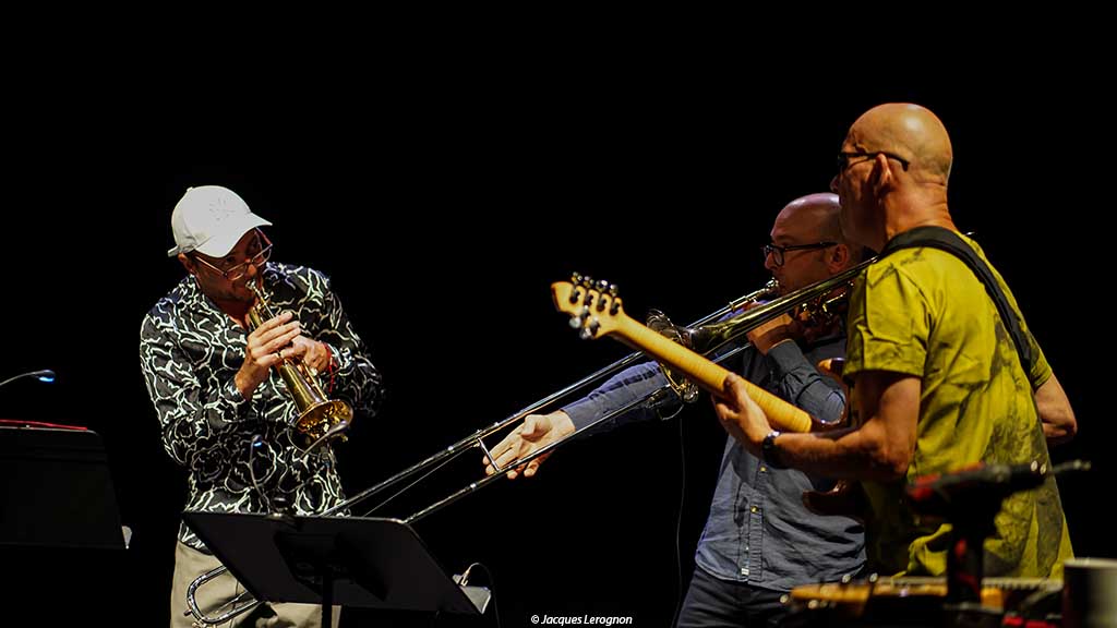 On profite un peu de la fraicheur extérieure avant de retrouver nos places et d’écouter enfin ce fameux quartet dont on ne connaissait que la version discographique. Trois soufflants accompagnent la guitare de Marc Ducret. Christophe Monniot aux saxophones alto et baryton, Fabrice Martinez trompette, bugle, picolo et euphonium et Samuel Blaser au trombone. Le projet créé pendant le confinement se nomme Ici car à l’époque on ne pouvait pas aller là-bas, nous dit le guitariste, un sourire en coin. Une suite en quatre parties comme les quatre saisons nécessaires à la création de ce répertoire. Le compositeur-guitariste est aussi metteur en scène de sa musique, ses trois compères prenant le souffle tour à tour, ou en duo, ou bien en trio répondant en des feux d’artifice de couleurs, de timbres. Pas d’instrument rythmique mais celle-ci est assurée par une espèce nouvelle de basse continue entretenue par la guitare et le trombone
