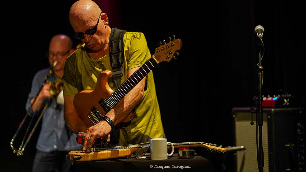 Par instants Marc Ducret délaisse sa guitare principale pour une plus petite, de voyage, posée sur une table, qu’il joue en taping ou avec divers objets allant du mug au bottleneck en passant par une visseuse-deviseuse (un ebow version Casto)