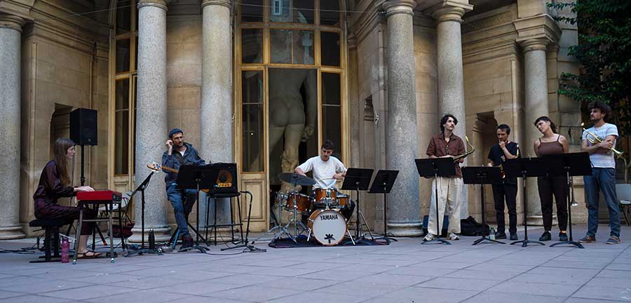 En prélude à la soirée, dans le très beau patio du conservatoire, on assite à la restitution de la masterclass menée par Marc Ducret avec des élèves de la classe jazz. Deux trompettes, deux saxophones, clavier, basse et batterie ont travaillé des partitions du guitariste. Belle cohésion du groupe et malgré le trac un très beau solo de trompette et de sax alto.